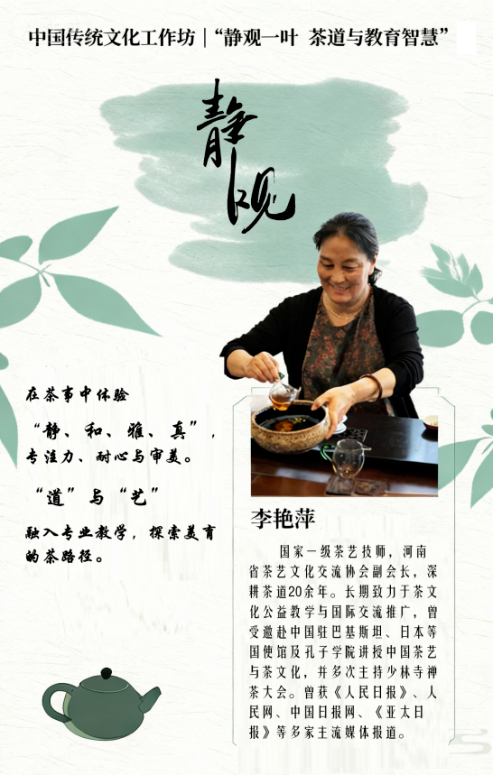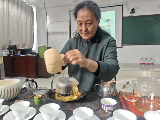 为全面提升教师文化素养、涵养、平和豁达的心性品格,2025年11月10日,公共教学部中华优秀传统文化教研室特邀国家一级茶艺技师、河南省茶艺文化交流协会副会长李艳萍到校,开展“静观一叶 茶道与教育智慧”主题茶艺演示活动。公共教学部书记赵玉涛、副主任买应霞及部分师生代表齐聚一堂,共赴这场茶香氤氲的文化之约。