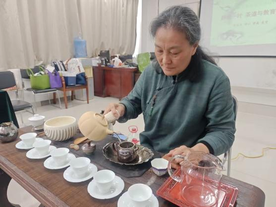 在氤氲茶香中,李艳萍老师进一步升华主题,解读了中国茶道“和、静、怡、真”的核心精神。她分享道,茶道不仅是技艺,更是“道法自然”、“知行合一”的生活哲学。通过泡茶品茗,可调节呼吸,安定心神,实现内在与外在的和谐统一。在互动环节,她结合自身经历,生动阐述了茶如何帮助她在喧嚣中寻得宁静,在平凡中洞见不凡。