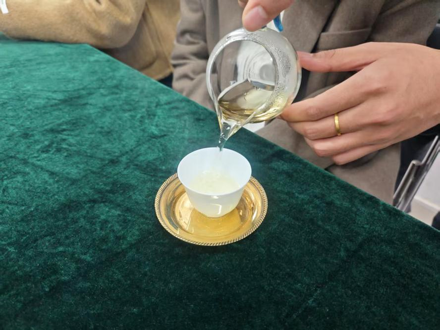在沉浸式冲泡演示环节,李艳萍老师先后用不同器具冲泡了白茶、酸茶、红茶、凤凰单丛(乌龙茶)与六堡茶(黑茶),每一步注水、出汤、分茶都从容雅致。白茶汤色黄白清透,滋味清甘鲜醇;野生酸茶自带微酸回甘,金黄茶汤引得众人称奇;红茶作为具有全球化影响力的茶类,风味浓郁、色泽温润,在印度、巴基斯坦等国广受欢迎;被誉为 “茶中香水” 的凤凰单丛,历经六次冲泡仍香气醇厚;收尾的六堡茶则兼具消暑祛湿、明目清心、助消化的功效,无论空腹饮用还是餐后解腻皆适宜。